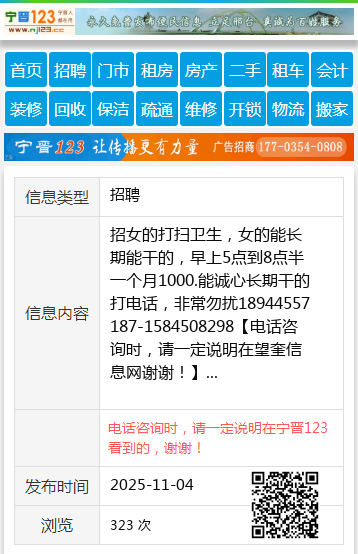 招女的打扫卫生,女的能长期能干的,早上5点到8点半一个月1000.能诚心长期干的打电话,非常勿扰18944557187-1584508298 【电话咨询时,请一定说明在望奎信息网看到的,谢谢!】 |
