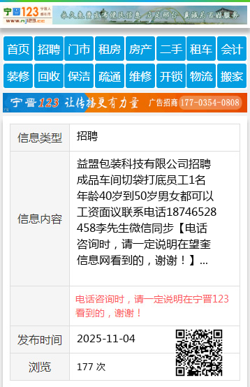益盟包装科技有限公司招聘成品车间切袋打底员工1名年龄40岁到50岁男女都可以工资面议联系电话18746528458李先生微信同步 【电话咨询时,请一定说明在望奎信息网看到的,谢谢!】 |