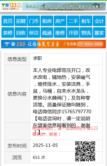 本人专业电焊带压开口,改水改电,铺地热,安装暖气,维修排水,安装洁具,手盆,马桶,自来水水龙头,更换分水器阀门,及各种零活等。质量保证随叫随到,电话微信同步15765797770 【电话咨询时,请一定说明在望奎信息网看到的,谢谢!】 |
