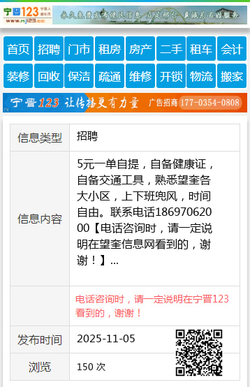 5元一单自提,自备健康证,自备交通工具,熟悉望奎各大小区,上下班兜风,时间自由。联系电话18697062000