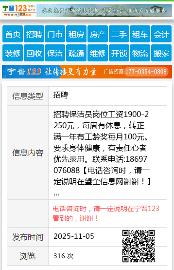 招聘保洁员岗位工资1900-2250元,每周有休息,转正满一年有工龄奖每月100元。要求身体健康,有责任心者优先录用。联系电话:18697076088 【电话咨询时,请一定说明在望奎信息网看到的,谢谢!】 |