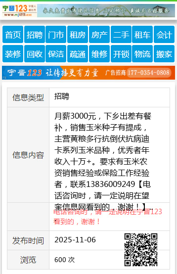 月薪3000元,下乡出差有餐补,销售玉米种子有提成,主营黄粮多行抗倒伏抗病迪卡系列玉米品种,优秀者年收入十万+。要求有玉米农资销售经验或保险工作经验者,联系13836009249 【电话咨询时,请一定说明在望奎信息网看到的,谢谢!】 |