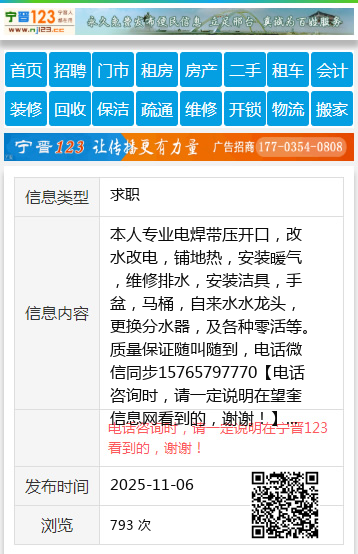 本人专业电焊带压开口,改水改电,铺地热,安装暖气,维修排水,安装洁具,手盆,马桶,自来水水龙头,更换分水器,及各种零活等。质量保证随叫随到,电话微信同步15765797770 【电话咨询时,请一定说明在望奎信息网看到的,谢谢!】 |