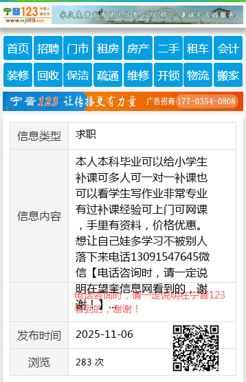 本人本科毕业可以给小学生补课可多人可一对一补课也可以看学生写作业非常专业有过补课经验可上门可网课,手里有资料,价格优惠。想让自己娃多学习不被别人落下来电话13091547645微信 【电话咨询时,请一定说明在望奎信息网看到的,谢谢!】 |