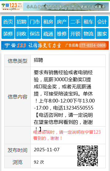 要求有销售经验或者电销经验,底薪3000➕全勤奖➕提成➕现金奖,或者无底薪通提,可接受陪读宝妈。单休!上午8:00-12:00下午13.00-17:00,电话13234550555 【电话咨询时,请一定说明在望奎信息网看到的,谢谢!】 |