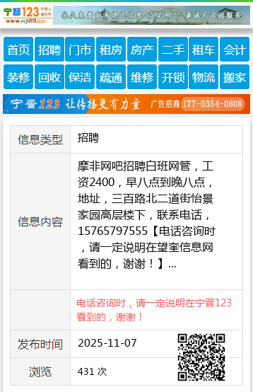 摩非网吧招聘白班网管,工资2400,早八点到晚八点,地址,三百路北二道街怡景家园高层楼下,联系电话,15765797555