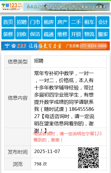 常年专补初中数学,一对一,一对二,价格低,本人有十多年教学辅导经验,带过多届初四毕业班学生,有想提升数学成绩的同学请联系我(随时试课)18645558627 【电话咨询时,请一定说明在望奎信息网看到的,谢谢!】 |