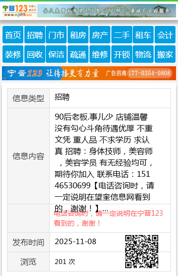 90后老板.事儿少 店铺温馨没有勾心斗角待遇优厚 不重文凭 重人品 不求学历 求认真 招聘:身体技师,美容师 ,美容学员 有无经验均可,期待你加入 联系电话:15146530699 【电话咨询时,请一定说明在望奎信息网看到的,谢谢!】 |