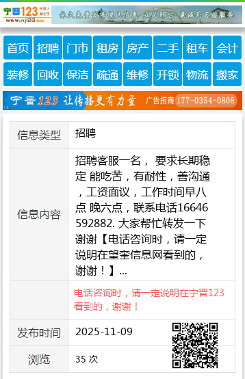 招聘客服一名, 要求长期稳定 能吃苦,有耐性,善沟通,工资面议,工作时间早八点 晚六点,联系电话16646592882. 大家帮忙转发一下谢谢 【电话咨询时,请一定说明在望奎信息网看到的,谢谢!】 |