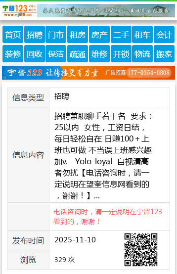 招聘兼职聊手若干名 要求:25以内 女性,工资日结,每日轻松自在 日赚100+上班也可做 不当误上班感兴趣加v. Yolo-loyal 自视清高者勿扰 【电话咨询时,请一定说明在望奎信息网看到的,谢谢!】 |