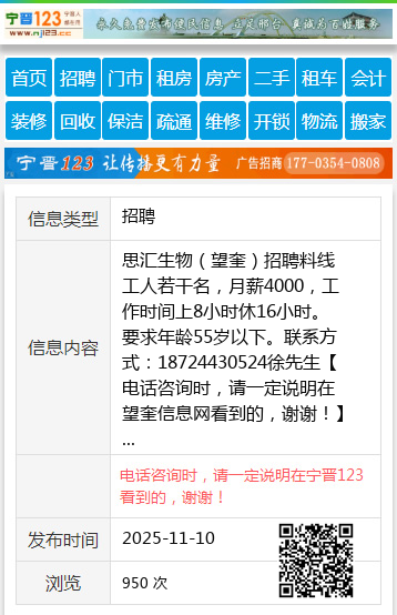 思汇生物(望奎)招聘料线工人若干名,月薪4000,工作时间上8小时休16小时。要求年龄55岁以下。联系方式:18724430524徐先生 【电话咨询时,请一定说明在望奎信息网看到的,谢谢!】 |