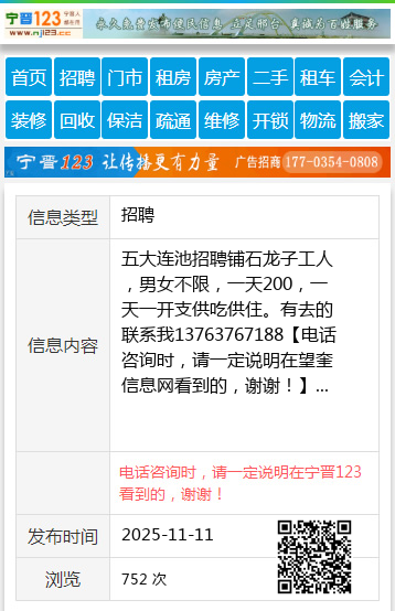五大连池招聘铺石龙子工人,男女不限,一天200,一天一开支供吃供住。有去的联系我13763767188