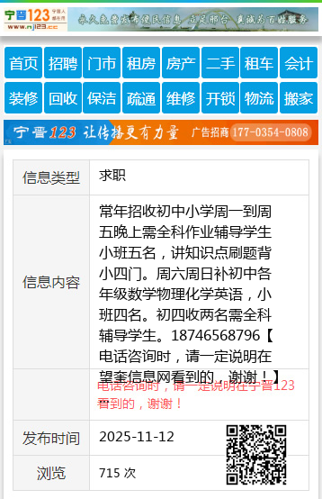 常年招收初中小学周一到周五晚上需全科作业辅导学生小班五名,讲知识点刷题背小四门。周六周日补初中各年级数学物理化学英语,小班四名。初四收两名需全科辅导学生。18746568796 【电话咨询时,请一定说明在望奎信息网看到的,谢谢!】 |