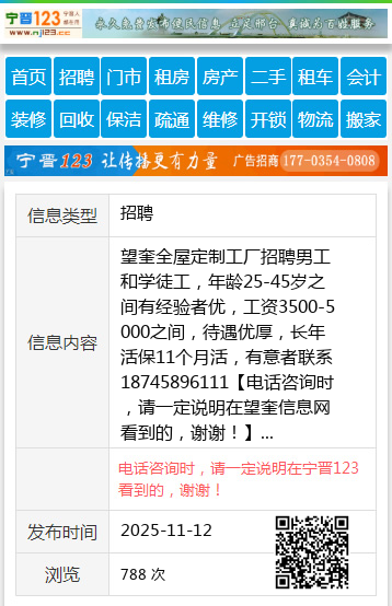 望奎全屋定制工厂招聘男工和学徒工,年龄25-45岁之间有经验者优,工资3500-5000之间,待遇优厚,长年活保11个月活,有意者联系18745896111 【电话咨询时,请一定说明在望奎信息网看到的,谢谢!】 |