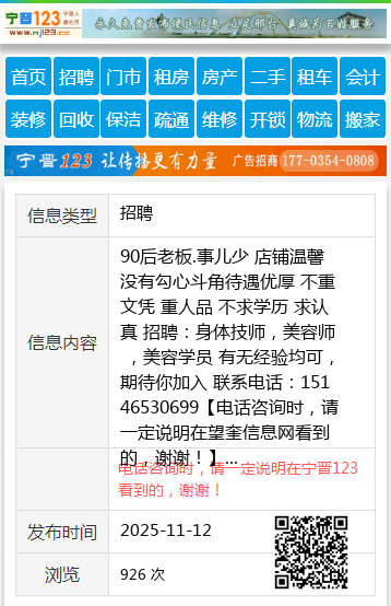 90后老板.事儿少 店铺温馨没有勾心斗角待遇优厚 不重文凭 重人品 不求学历 求认真 招聘:身体技师,美容师 ,美容学员 有无经验均可,期待你加入 联系电话:15146530699 【电话咨询时,请一定说明在望奎信息网看到的,谢谢!】 |