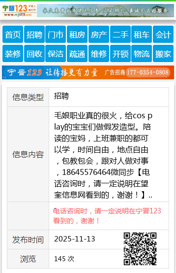 毛娘职业真的很火,给cos play的宝宝们做假发造型。陪读的宝妈,上班兼职的都可以学,时间自由,地点自由,包教包会,跟对人做对事,18645576464微同步 【电话咨询时,请一定说明在望奎信息网看到的,谢谢!】 |