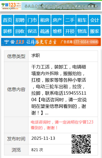 干力工活,装卸工,电镐砸墙室内外拆除,搬搬抬抬,扛楼,搬家等等各种小零活,电动三轮车出租,拉货,拉脚,联系电话15945551104 【电话咨询时,请一定说明在望奎信息网看到的,谢谢!】 |