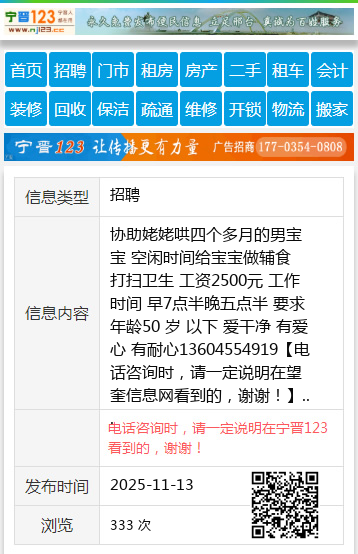 协助姥姥哄四个多月的男宝宝 空闲时间给宝宝做辅食 打扫卫生 工资2500元 工作时间 早7点半晚五点半 要求年龄50 岁 以下 爱干净 有爱心 有耐心13604554919 【电话咨询时,请一定说明在望奎信息网看到的,谢谢!】 |