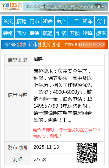 岗位要求:负责安全生产,维修,保养要求:高中及以上学历,相关工作经验优先,薪资:4000-6000元,缴纳五险一金,联系电话:13149557799 【电话咨询时,请一定说明在望奎信息网看到的,谢谢!】 |