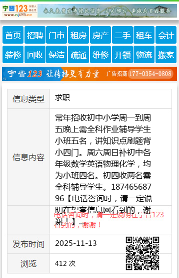 常年招收初中小学周一到周五晚上需全科作业辅导学生小班五名,讲知识点刷题背小四门。周六周日补初中各年级数学英语物理化学,均为小班四名。初四收两名需全科辅导学生。18746568796 【电话咨询时,请一定说明在望奎信息网看到的,谢谢!】 |