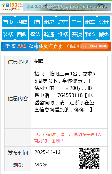 招聘:临时工男4名,要求55周岁以下,身体健康,干活利索的,一天200元,联系电话:1764553118