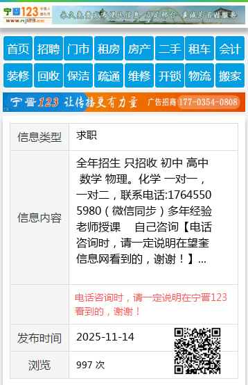 全年招生 只招收 初中 高中 数学 物理。化学 一对一,一对二,联系电话:17645505980(微信同步)多年经验老师授课 自己咨询 【电话咨询时,请一定说明在望奎信息网看到的,谢谢!】 |