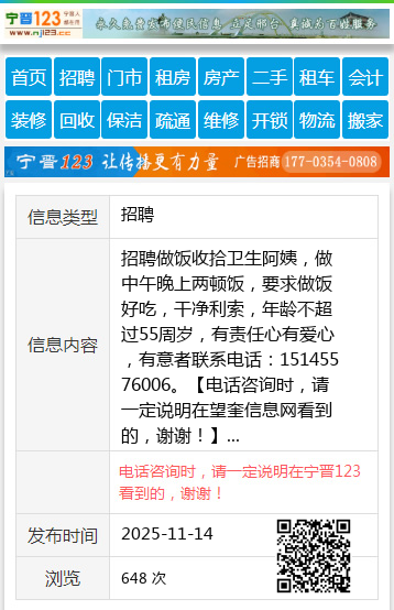招聘做饭收拾卫生阿姨,做中午晚上两顿饭,要求做饭好吃,干净利索,年龄不超过55周岁,有责任心有爱心,有意者联系电话:15145576006。 【电话咨询时,请一定说明在望奎信息网看到的,谢谢!】 |