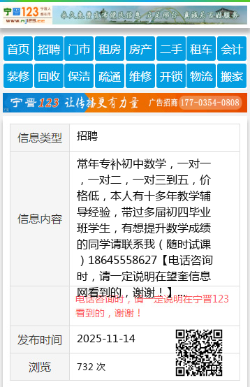常年专补初中数学,一对一,一对二,一对三到五,价格低,本人有十多年教学辅导经验,带过多届初四毕业班学生,有想提升数学成绩的同学请联系我(随时试课)18645558627 【电话咨询时,请一定说明在望奎信息网看到的,谢谢!】 |