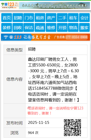 鑫达印刷厂聘男女工人,男工资5500-6500元,女2800-3000 元,男早上7点~6.30,女早上7点~晚上5点,地址西环南六道街加气站西电话15184567788微信同步 【电话咨询时,请一定说明在望奎信息网看到的,谢谢!】 |