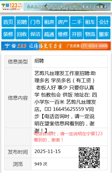 艺剪凡丝理发工作室招聘:助理多名 学员多名(有工资) 老板人好 事少 只要你认真学 包教包会 供饭 地址在: 四小学东一百米 艺剪凡丝理发店。☎️ 16645625559 V同步 【电话咨询时,请一定说明在望奎信息网看到的,谢谢!】 |