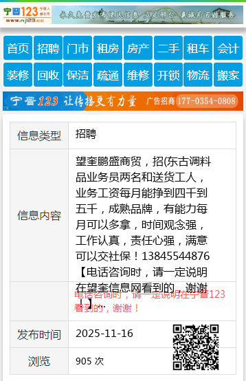 望奎鹏盛商贸,招(东古调料品业务员两名和送货工人,业务工资每月能挣到四千到五千,成熟品牌,有能力每月可以多拿,时间观念强,工作认真,责任心强,满意可以交社保!13845544876 【电话咨询时,请一定说明在望奎信息网看到的,谢谢!】 |