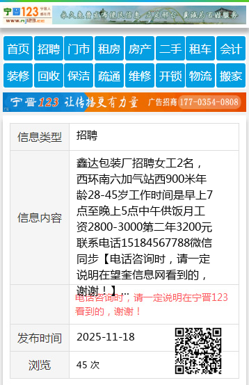 鑫达包装厂招聘女工2名,西环南六加气站西900米年龄28-45岁工作时间是早上7点至晚上5点中午供饭月工资2800-3000第二年3200元联系电话15184567788微信同步 【电话咨询时,请一定说明在望奎信息网看到的,谢谢!】 |
