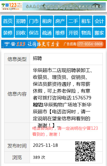 华辰超市二店现招聘装卸工、收银员、理货员、促销员、保洁员薪资待遇好,有带薪休假,可上养老保险,有意者可拨打咨询电话:15765798271