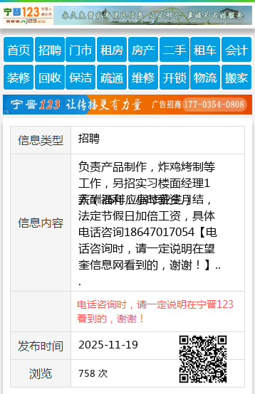 负责产品制作,炸鸡烤制等工作,另招实习楼面经理1人(26年应届毕业生) 薪酬福利:小时薪资月结,法定节假日加倍工资,具体电话咨询18647017054