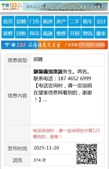 望奎鑫悦洗浴 招聘男浴室服务生。两名。联系电话:187 4652 6999