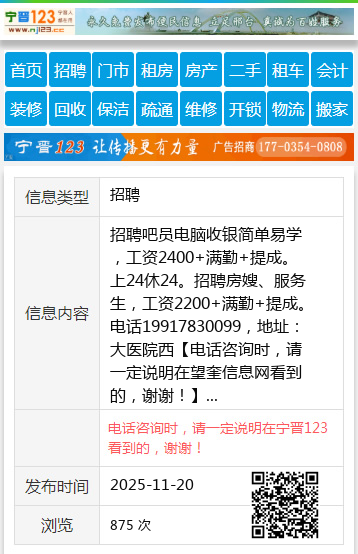 | 防骗提醒: | 望奎信息网(www.wangkui.cc)提醒您:手工活、网络兼职、刷单,都是骗子!凡以各种名义收取费用的都是骗子!找工作是往兜里挣钱,让你往外掏钱的都是骗子!异地招聘请提高警惕,谨防诈骗! |