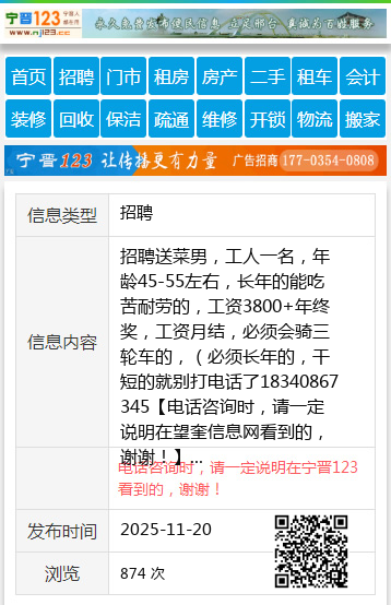 招聘送菜男,工人一名,年龄45-55左右,长年的能吃苦耐劳的,工资3800+年终奖,工资月结,必须会骑三轮车的,(必须长年的,干短的就别打电话了18340867345 【电话咨询时,请一定说明在望奎信息网看到的,谢谢!】 |