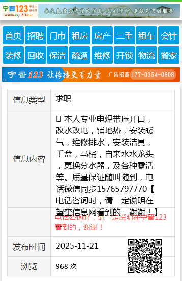 本人专业电焊带压开口,改水改电,铺地热,安装暖气,维修排水,安装洁具,手盆,马桶,自来水水龙头,更换分水器,及各种零活等。质量保证随叫随到,电话微信同步15765797770 【电话咨询时,请一定说明在望奎信息网看到的,谢谢!】 |