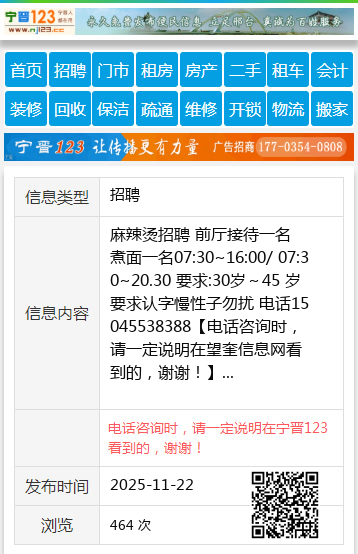 麻辣烫招聘 前厅接待一名 煮面一名07:30~16:00/ 07:30~20.30 要求:30岁~45 岁 要求认字慢性子勿扰 电话15045538388 【电话咨询时,请一定说明在望奎信息网看到的,谢谢!】 |
