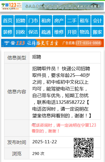 招聘取件员! 快递公司招聘取件员,要求年龄25—40岁之间,初中或初中文化以上均可,能驾驶电动三轮车,自己带车优先,短期工勿扰,联系电话13258582722 【电话咨询时,请一定说明在望奎信息网看到的,谢谢!】 |