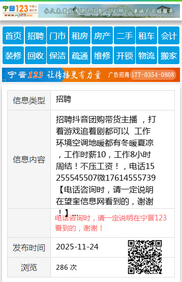 招聘抖音团购带货主播 ,打着游戏追着剧都可以 工作环境空调地暖都有冬暖夏凉,工作时薪10,工作8小时周结!不压工资!,电话15255545507微17614555739 【电话咨询时,请一定说明在望奎信息网看到的,谢谢!】 |