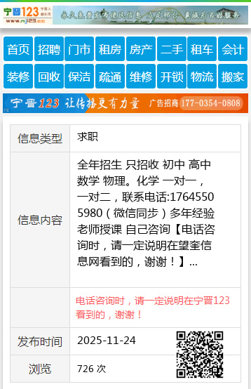 全年招生 只招收 初中 高中 数学 物理。化学 一对一,一对二,联系电话:17645505980(微信同步)多年经验老师授课 自己咨询 【电话咨询时,请一定说明在望奎信息网看到的,谢谢!】 |