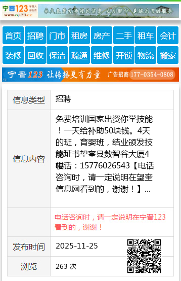免费培训国家出资你学技能!一天给补助50块钱。4天的班,育婴班,结业颁发技能证书