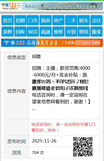 招聘:主播,薪资范围:4000-6000元/月+奖金补贴:面谈