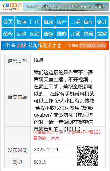 我们这边招的是抖音平台语音聊天室主播,不开视频 ,在麦上闲聊,兼职全职都可以的。 在家有手机带耳机就可以工作 新人小白有师傅教 全程不收取任何费用 微信xuyabei7 非诚勿扰 【电话咨询时,请一定说明在望奎信息网看到的,谢谢!】 |