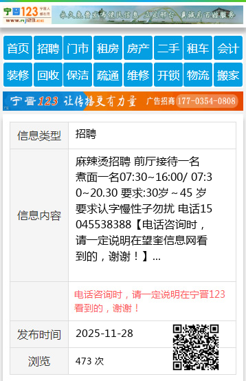 麻辣烫招聘 前厅接待一名 煮面一名07:30~16:00/ 07:30~20.30 要求:30岁~45 岁 要求认字慢性子勿扰 电话15045538388 【电话咨询时,请一定说明在望奎信息网看到的,谢谢!】 |