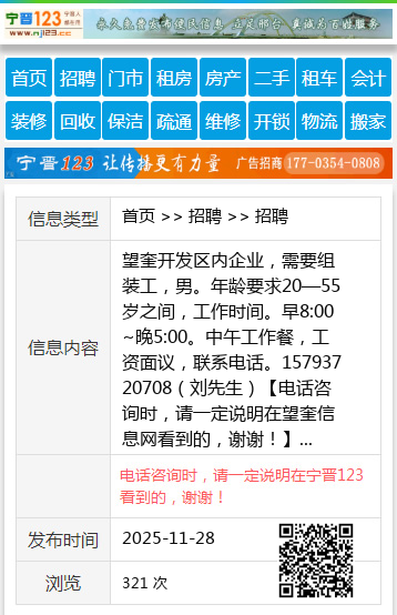 望奎开发区内企业,需要组装工,男。年龄要求20—55岁之间,工作时间。早8:00~晚5:00。中午工作餐,工资面议,联系电话。15793720708(刘先生)