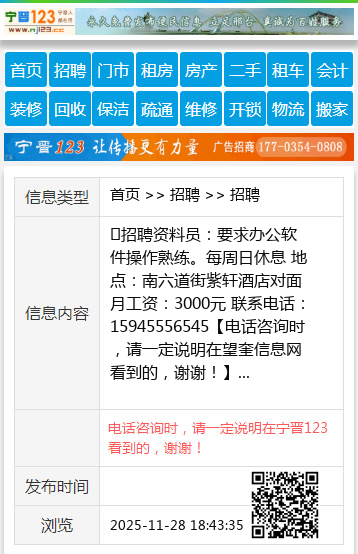 招聘资料员:要求办公软件操作熟练。每周日休息 地点:南六道街紫轩酒店对面 月工资:3000元 联系电话:15945556545 【电话咨询时,请一定说明在望奎信息网看到的,谢谢!】 |