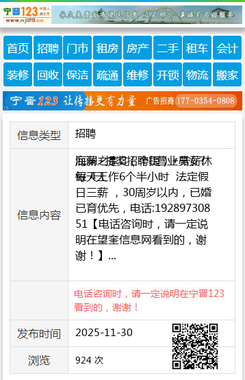 每天工作6个半小时 法定假日三薪 ,30周岁以内,已婚已育优先,电话:19289730851 【电话咨询时,请一定说明在望奎信息网看到的,谢谢!】 |
