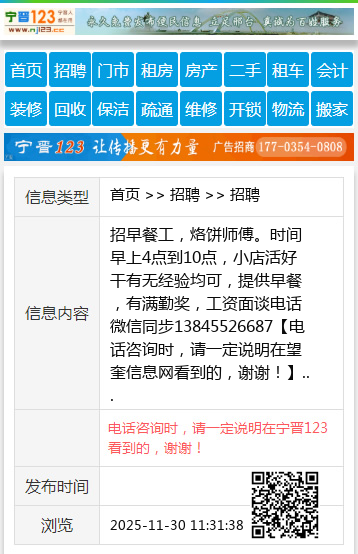 招早餐工,烙饼师傅。时间早上4点到10点,小店活好干有无经验均可,提供早餐,有满勤奖,工资面谈电话微信同步13845526687 【电话咨询时,请一定说明在望奎信息网看到的,谢谢!】 |